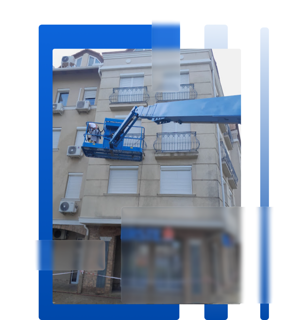 Épületek külső felületeinek szakszerű tisztítása, algák és lerakódások eltávolítása.